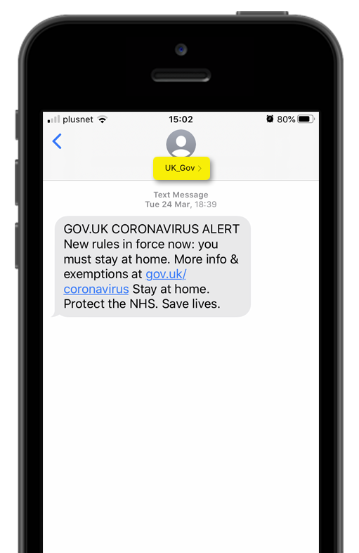 To help tackle the growing issue, the UK government has added both UK_GOV and UKGOV to the list of restricted SMS Sender ID. Ensuring all text messages sent using these sender IDs are automatically stopped by mobile networks, and therefore are not delivered to recipients unless coming from an official channel – please see example message to right-hand side, with sender ID highlighted for reference.
