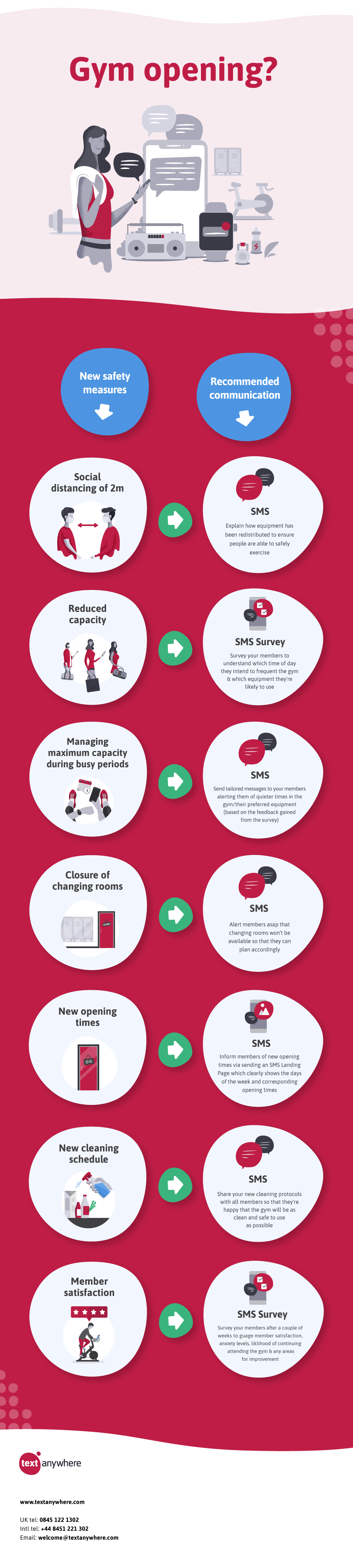 Consequently, the focus for gyms needs to be around how to balance sharing the new safety protocols while ensuring their members feel safe and content enough to return to the gym.