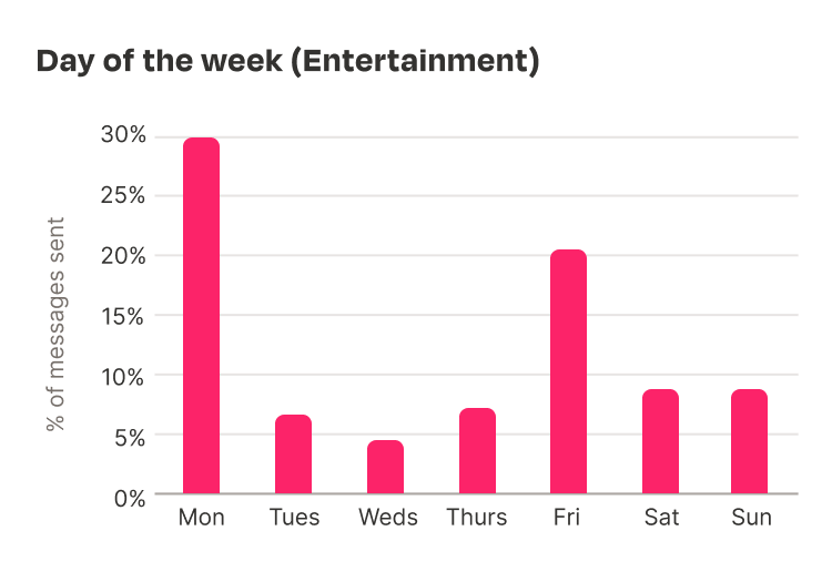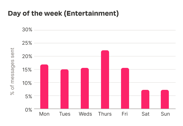 Tuesday takes up 24% of all messages sent in the entertainment industry after the data correction, followed closely by Monday and Thursday, which take 19% and 22% respectively. Across those three days, they make up nearly two thirds of all messages sent in the rest of the entertainment industry.