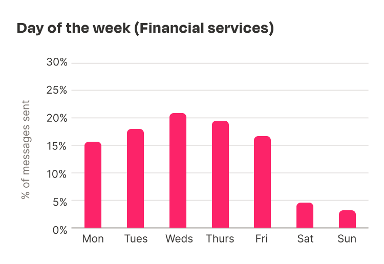 For the financial services industry, Wednesday is the most popular day to send SMS messages. In fact, we see an inverse of the pattern displayed by the retail sector, with a slower start to the week followed by a midweek uptick, and a small downturn before dropping off at the weekend.
