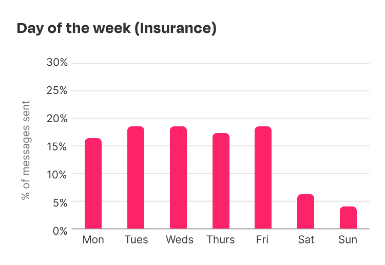 An example of this use case within healthcare is pharmacies who use the platform to notify patients of prescription deliveries. Due to the nature of these messages, they’re typically sent throughout the week at regular intervals. Especially noticeable when compared to other industries who use the platform for more traditional promotional-style messages.