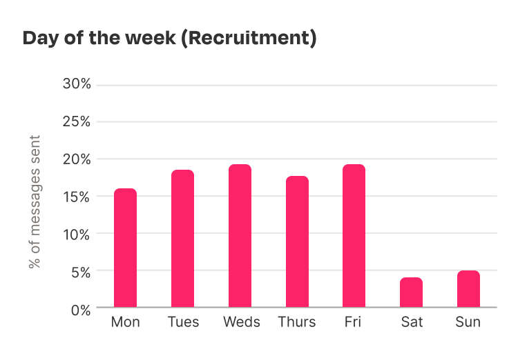 The recruitment industry, like many of those we’ve looked at in this blog, has a relatively even distribution of messages across the working week, with both Tuesday and Friday reigning supreme as most popular. Following this, there is a significant drop in activity with Saturday and Sunday between them making up less than 10% of all messages sent.