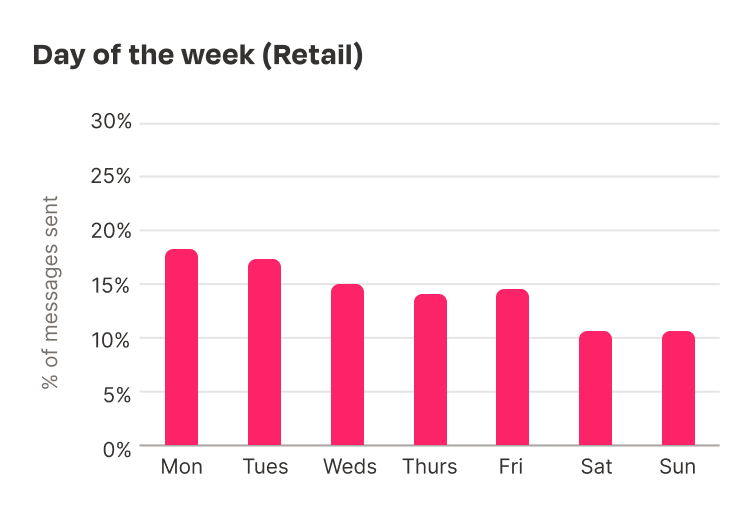 Monday is the close winner for retail, with 18% of the retail industry’s messages being sent on the first day of the week. Interestingly, Tuesday is also a strong day for retail, with Monday and Tuesday taking just less than 40% of all messages between them.