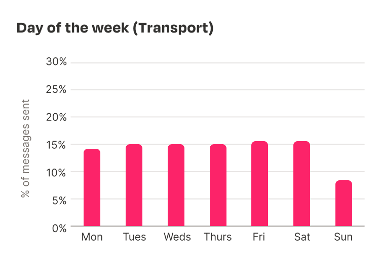 Overall, Saturday is the most popular, but Friday is not far behind. Despite the large variation of companies which fall under the umbrella of “Transport”, it is our most consistently distributed industry. Every day except for Sunday has either a 15% or 16% share of message send volume for this sector.